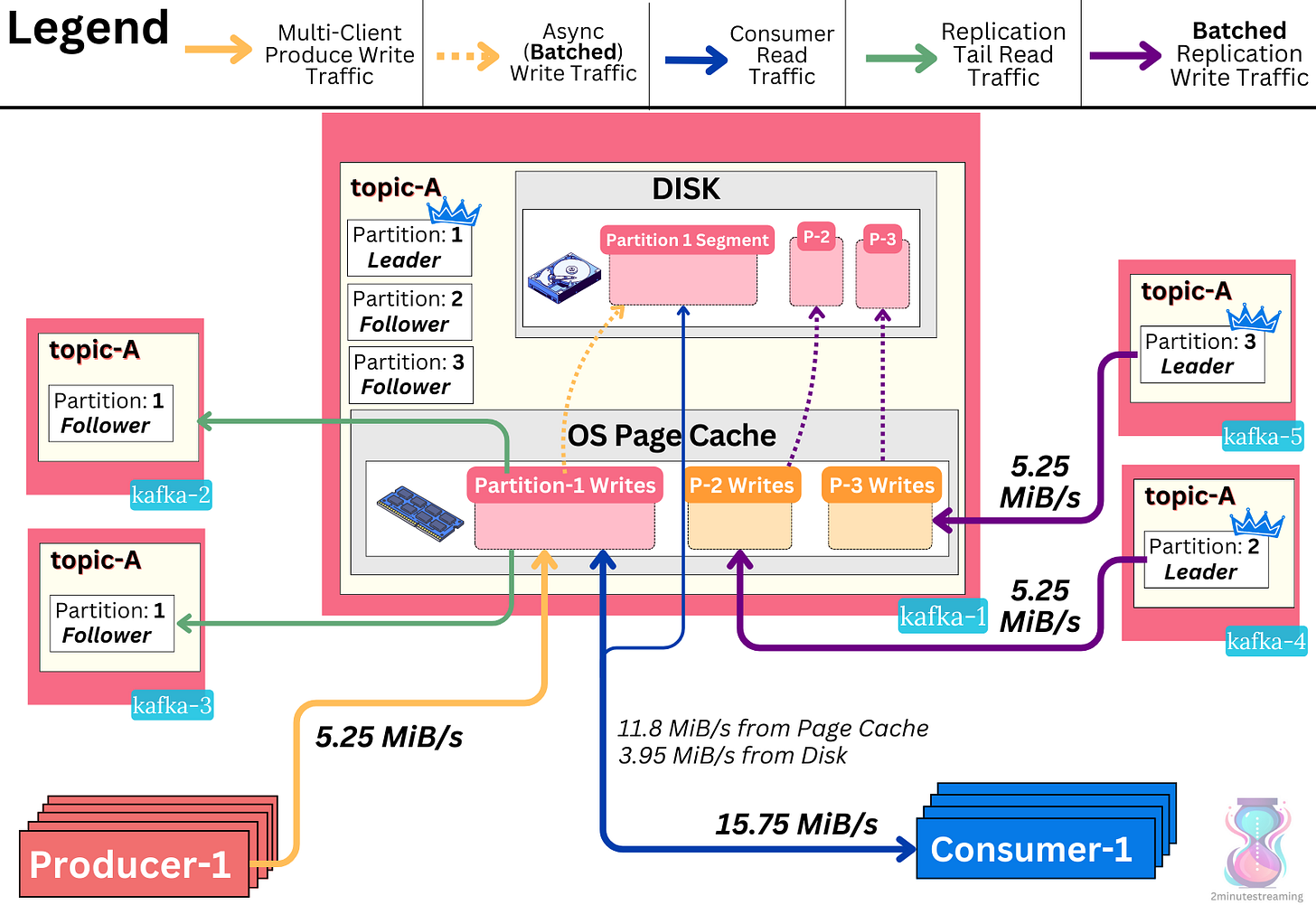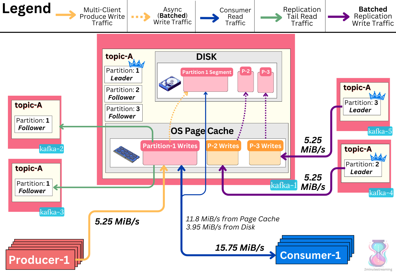 On average, each broker in our setup accepts 5.25 MiB/s of new data from the producers, as well as 10.5 MiB/s of replication from other brokers8. This results in ~15.75 MiB/s of disk writes.