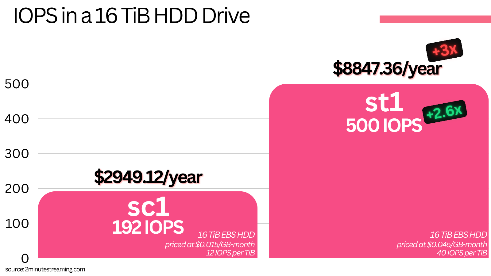 Note that for these HDDs, the actual IOPS given by AWS is counted in MiB/s, because it assumes every IO is 1 MiB. This is somewhat of a fair assumption by them, because as mentioned their software additionally tries to coalesce sequential IOs.